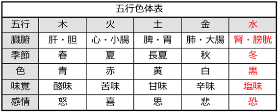 五行の対応で見ると、冬は「水」に属し色では黒、味では塩味、